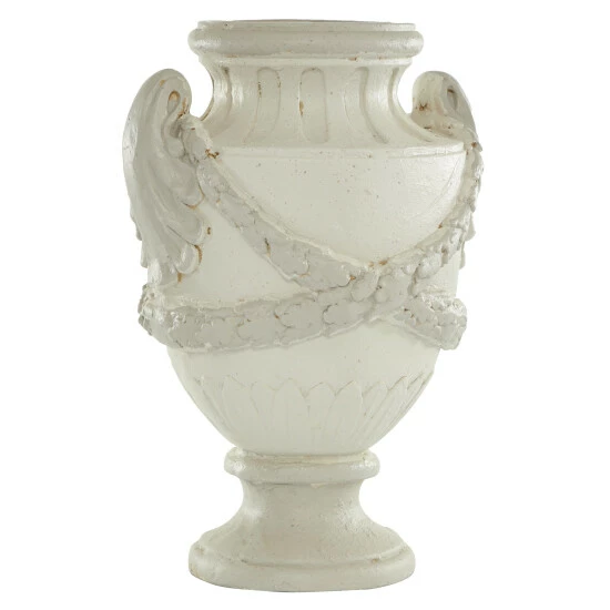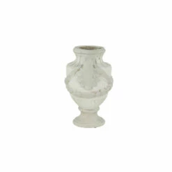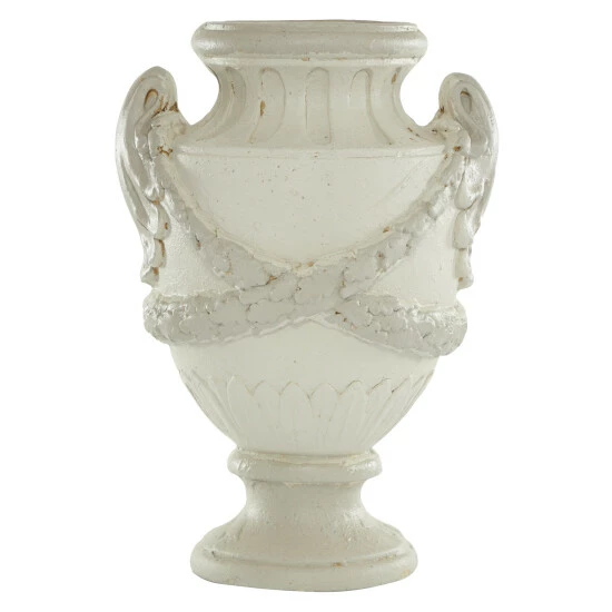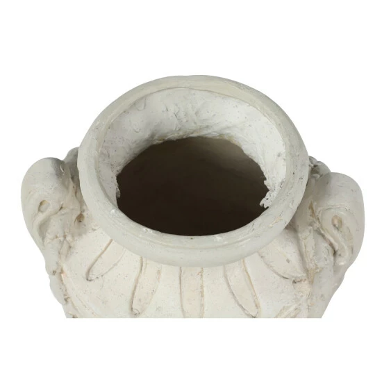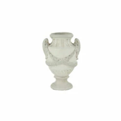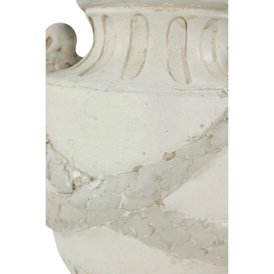Achieve elegant country cottage style by adding this light beige and stone-gray colored large vase to your home decor… Large and heavy, this urn-shaped antique vase makes its presence known with its detailed, hand-carved acanthus design and contrast-colored decorative rope throughout its body. The unique, wing-shaped handles add antiquated charm to the silhouette, which opens up into a wide mouth to hold a large bouquet of flowers or vase filler. However, this urn is dramatic enough to simply display as a stand-alone piece of antique decor.