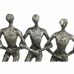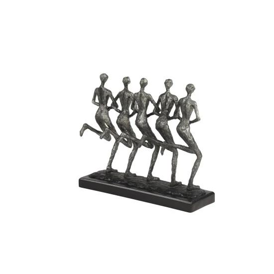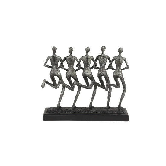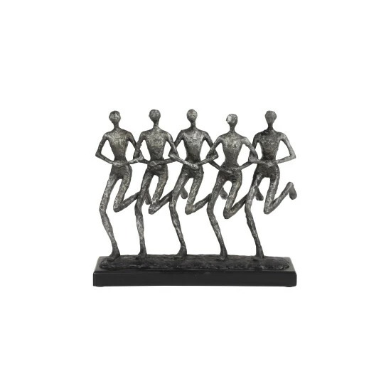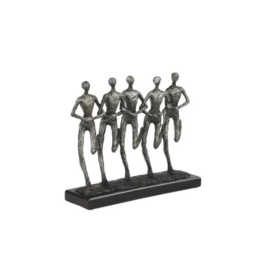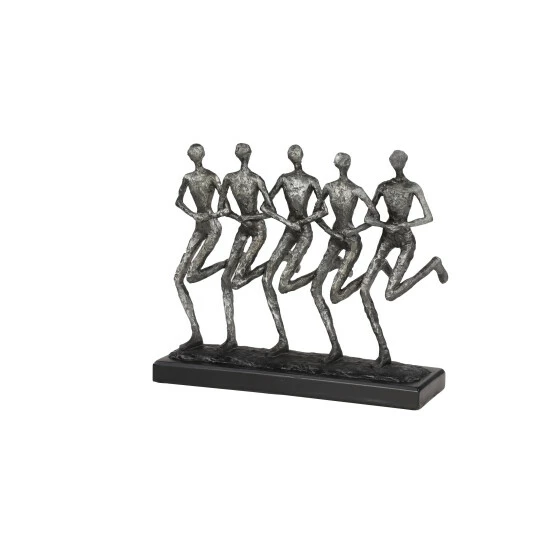 Lightweight resin is sculpted into five human figurines, each running with their arms linked together. Uniform in size and movement, the human sculptures are symmetrical, and all have a textured silver finish over their lean bodies. The figures are secured to a rectangular black base.