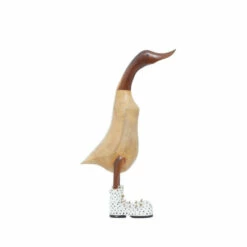 Add a fun, lighthearted accent to your decor with this set of two duck sculptures. Carved of solid bamboo, this set includes a mother duck and her baby, both of which are wearing cute polka dot boots. These unique ducks make a great centerpiece to your dining table or on any shelf.