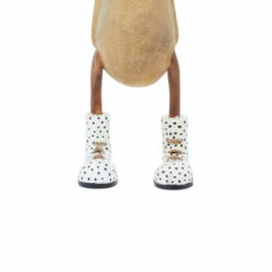 - White boots with navy-blue polka dots