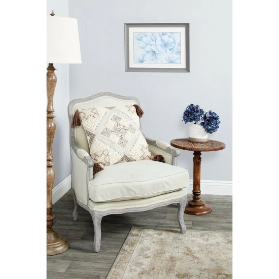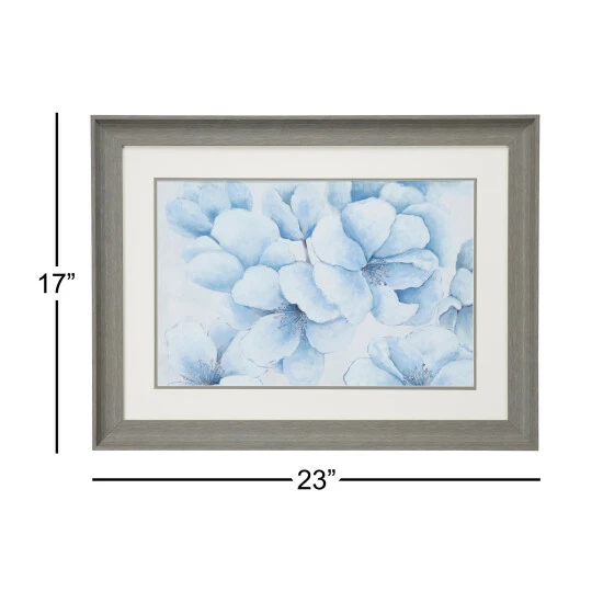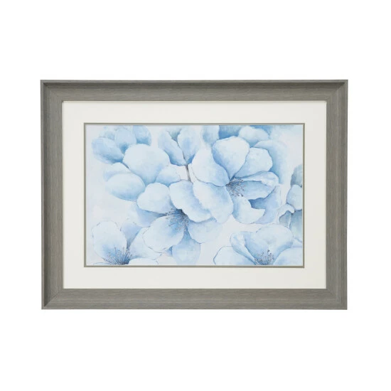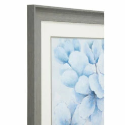 Soft and fluid, this blue flower illustration brings a light, airy feel to any room of the house… A soft, cool color palette with light blue, sky blue, white, and dark blue hues create a bundle of soft blue flowers with a watercolor look. The flower print lies beneath a white mat board with a gray stripe housed in a wide, textured gray wooden frame.