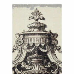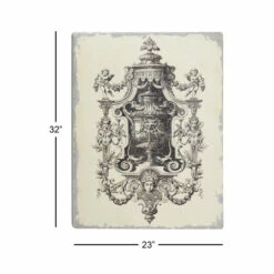 - Vintage decor wall piece with an antique white finish over a gray background; soft black chandelier, finial, cherub angels, floral garland, crowns, acanthus, faces, trumpets, leaves, and other decorative designs in a black ink, all with a screen-printed, stamp-like texture