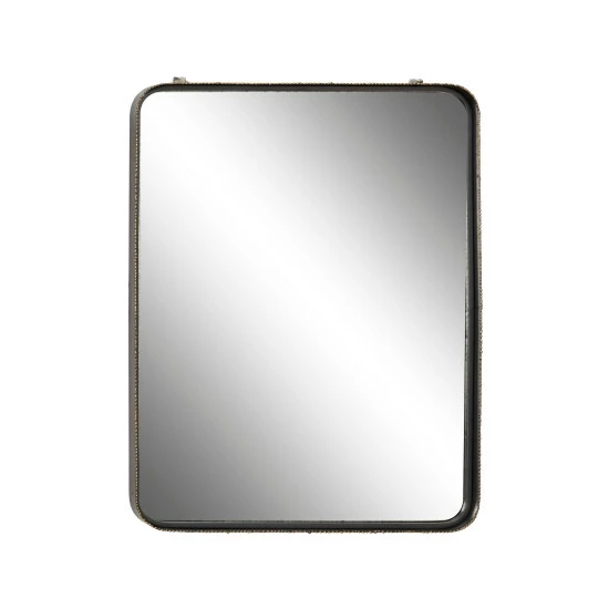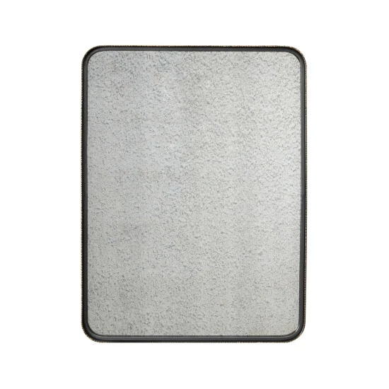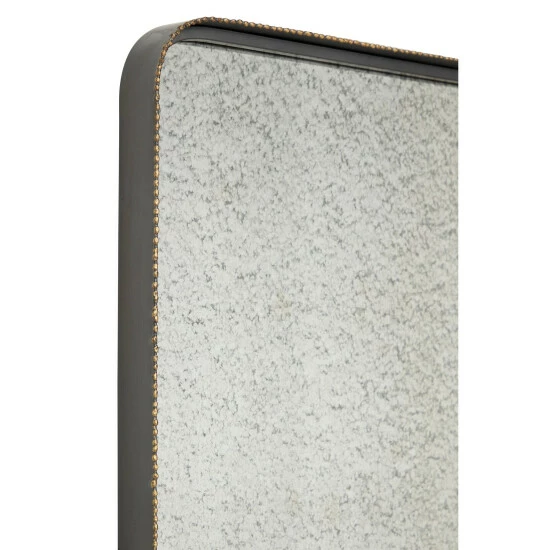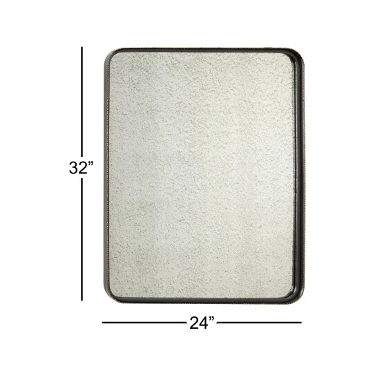 Textural and rich with antique charm, this vintage style rectangular wall mirror makes for beautiful antique wall decorโฆ From the brushed gold metal over the bead-like trim to the antique wash finish over the glass mirror, this decorative wall mirror will pull together any room with textural vintage style.. Vintage style rectangular wall mirror with iron frame and glass mirror. Decorative hanging mirror with textural wash finish over the mirror; dark gray iron frame with decorative metallic gold over the metal bead-like trim; rounded corners. Large mirror measures 24″L x 1″W x 32″H and weighs 19.6 lbs., easy to vertically hang by the metal keyhole hardware in the back. .