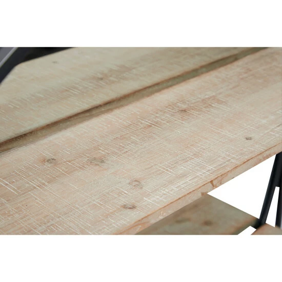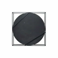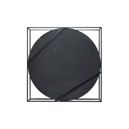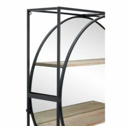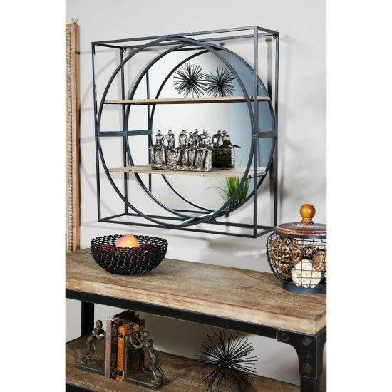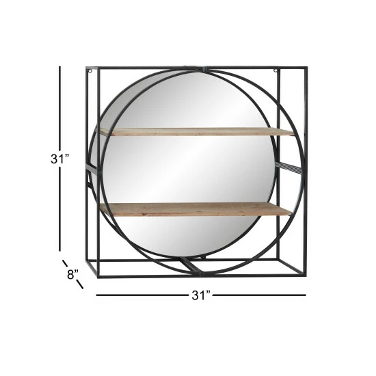 Add dimension and Industrial style to your space with this large metal wall mirror with a square metal cage frame and 2 wood shelves. Full of industrial style with layers of dimension, the round mirror is housed in a black iron frame adhered to a square-shaped black iron cage, creating a dual-shape effect of a circle in a square. The reflective glass mirror has 2 textural light beige Chinese fir and pine wood shelves with a whitewash finish over the crosshatch texture. Mixed media metal meets wood coupled with the bold shapes and double-duty decor and storage, this industrial mirror is a both a cool accent piece and a wall shelf in one.