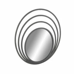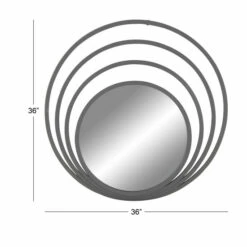 - 36″ x 1″ contemporary metal wall mirror, features a wall mirror’s frame designed in a series of four inner circles made from solid iron material, features a round mirror in the middle made from solid glass, designed with a smooth finish in gray coating