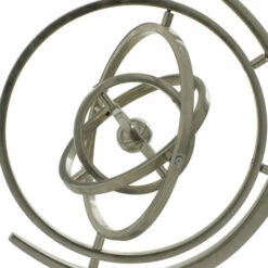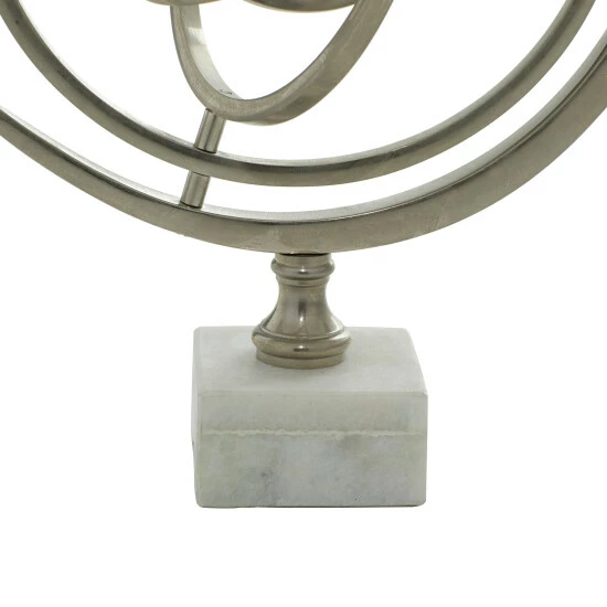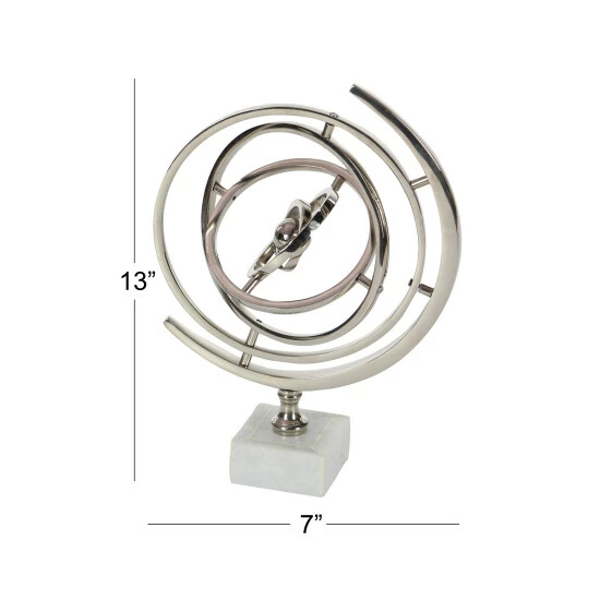 Designed to sit on a study desk, console table, credenza, dresser, or other tabletop surfaces, this silver armillary sphere elevates the look of modern and contemporary interiors. It was made from aluminum, features a shiny metal finish throughout, and stands on a stoneware base. The rings are movable for both hands-on entertainment and home decoration purposes. Designed with black rubber stoppers at the base that prevent scratching furniture and table tops, as well as sliding around. This item ships in 1 carton. This world globe measures 9″ diameter. Suitable for indoor use only. Made in India. Glam Design.