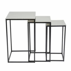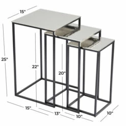 Throw in candles or a vase with freshly cut flowers to complement these set of sophisticated accent furniture as a side, end, or coffee tables for your interior home space. Bring a finishing touch to your home with an inviting appeal with this beautifully crafted accent table. A compact friendly table providing you with additional storage space any where in your home. This table set comes with mounting hardware to prevent tipping. Suitable for indoor use only. Maximum weight limit is 250 lbs. Made in India. Set of 3 square nesting tables. Contemporary design.