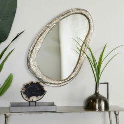 Create a stylish living area as you hang this gold or silver wall mirror on bold-toned backgrounds with warm lighting and natural greenery. Wall mirrors offer a reflective property that helps naturally brighten up any room in your home. Maximize your wall space and provide a larger appearance to any room with our chic wall mirror. This item comes shipped in one carton. Wall mirror comes with loop hardware at the back for easy hanging via nail or screw. Made in India. Suitable for indoor use. Contemporary style.