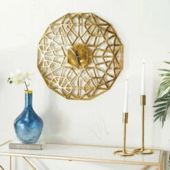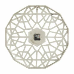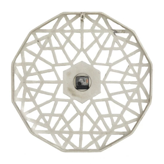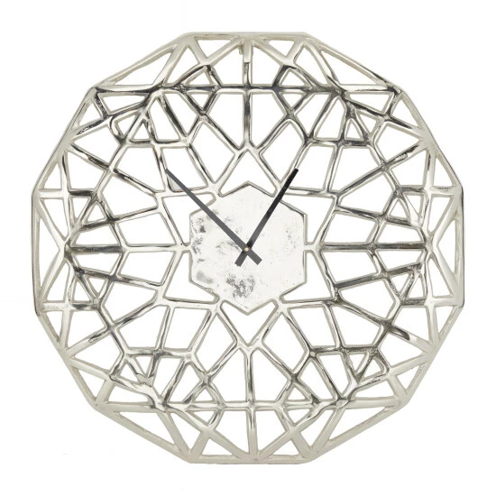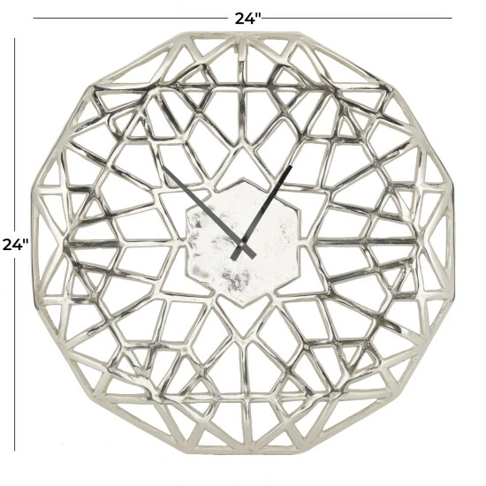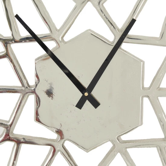 Like a functional art piece for your wall, this round wall clock will become a focal point or finishing touch for any room in your contemporary-themed home with its striking cut-out design. Take control of your day and keep track of time with this classic designed wall clock with a modern flare. Bring functionality and style into your home with statement wall clock to maximize any open wall space. Requires 1 AA battery. This item comes shipped in one carton. This silver wall clock accentuates an open-designed clock face with minimalist straight clock hands. The clock mechanism runs silent. Item comes with metal hardware at the back for easy and secure hang. Suitable for indoor use only. Made in India. Contemporary Style.