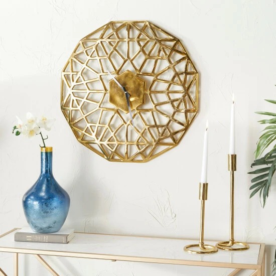 - An aluminum wall clock featuring a round clock face with cut-out geometric pattern and black minimalist clock hands