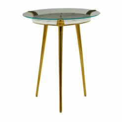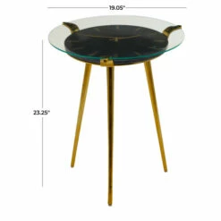 - Round side table carries metallic gold accents, clear glass, and a black or white marble tabletop