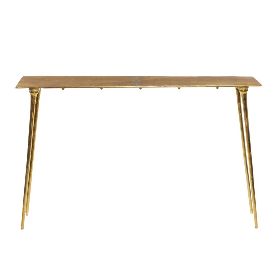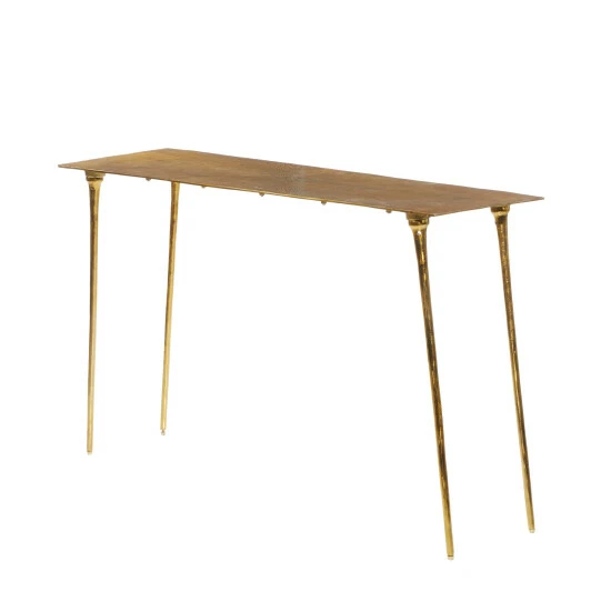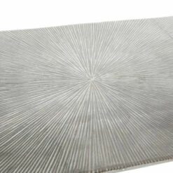 - An aluminum console table featuring a wide rectangular table top with a sunburst pattern and splayed legs