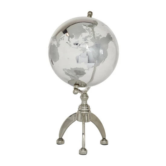 - Glam style silver accent piece features a glass orb with aluminum axis and tripod base