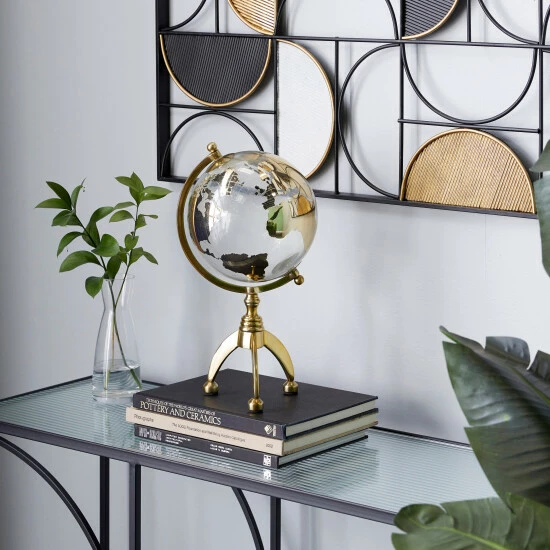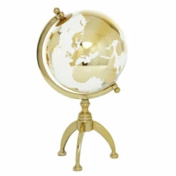 Experience the world in your grasp with our decorative globe with tripod base! Place this globe on any accent table to show your love for traveling. Embark on an exciting adventure with this world globe Decor. Displayed on the coffee or console tables of your office or living room, entryways or hallways, this globe is an elegant addition to any home. This item ships in two cartons. This decorative globe with stand measures 7. 50″ in diameter. Suitable for indoor use only. Made in India. Glam theme.