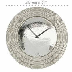 A mix of style and function, this small round wall clock adds Hollywood to most home interiors. The accent piece, made from aluminum, features a numberless silver-finished clockface. Layered, raised ridges highlight the clock’s outer frame while hands in a smooth black finish complete the sleek look. Display alone, or as a stylish supplement to a gallery wall, this clock is an excellent time-keeping accent in modern and glam style homes. Requires 1 AA battery that is not included in the package. This clock has a numberless face. The clock mechanism runs silent. This item hangs via keyhole hardware. Suitable for indoor use only. Glam theme. This item comes shipped in one carton.