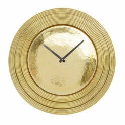 - The numberless face of this round metal wall clock is highlighted by a reflective silver/gold panel and layered, raised ridges on the frame