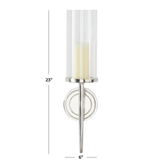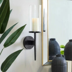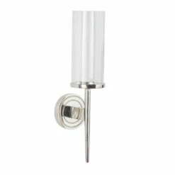 - Our silver, gold, or black candle wall sconce showcases a tall cylinder glass candle holder designed with a pointed tail and a round extended arm wall mount