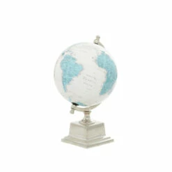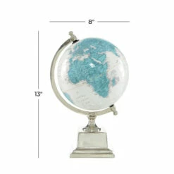 Whether displayed on your office desk or in your home, this beautifully detailed world globe makes eye-catching accent decor. The globe itself is on an angled axis and features saturated, bright turquoise continents, juxtaposing the white oceans, all labeled in black lettering. The polished finial on the silver axis has a screw to adjust the axis, and the stacked square base with the polished metallic silver finish adds a stately look to this table decor. This item ships in 1 carton. This world globe measures 8″ diameter. Suitable for indoor use only. Made in India. Traditional theme.