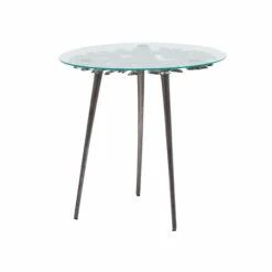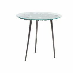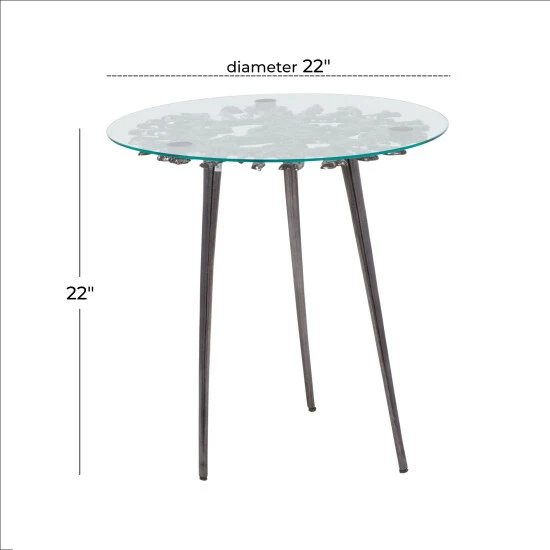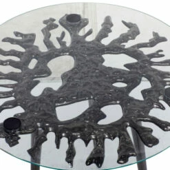 - Eccentric splash-patterned metalwork is elaborated in this accent table with a clear glass top showcasing a chic and mod style