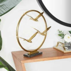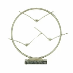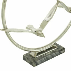 Add some chic flair decor within your space with this modern bird sculpture decor piece. This bird sculpture is made of aluminum with a metallic silver/gold finish and dark colored marble base. It features three bird figurines crafted in India and made from aluminum and mounted on a dark marble base. A modern themed home complements this decorative sculpture the best, but is suitable for any home in need of some livening up. It has a weight of 5. 36 lbs. with a dimension of 19”x18”. A sophisticated sculpture with classic colors adds dimensions and modern appeal to any space. Wipe clean with a dry cloth. Suitable for indoor use only. Made in India. Modern design. This item comes shipped in one carton.