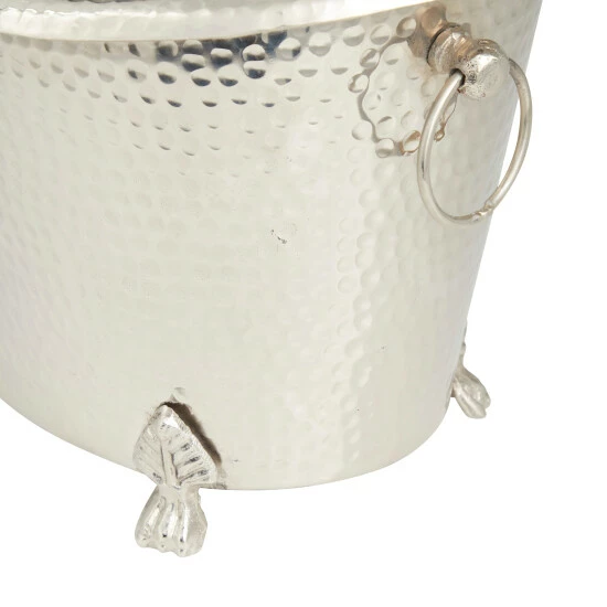 - CHammered aluminum piece featuring a bucket-inspired wine storage with deep structure, round side handles, and decorative feet with flourish details