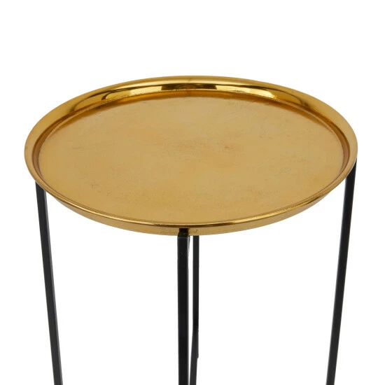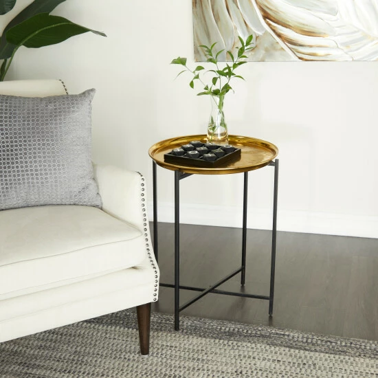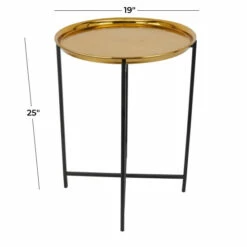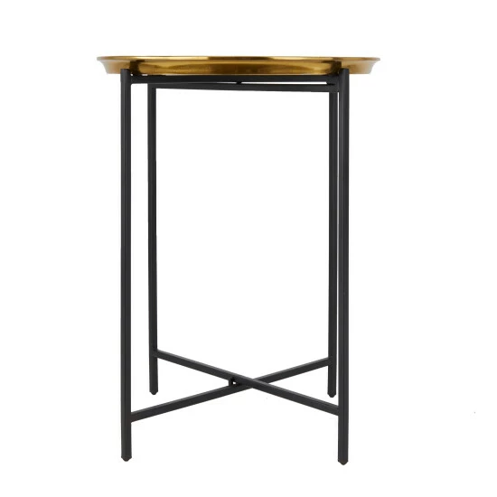 - A sleek and minimalist style flaunts this gold accent table with round levelled detachable top and trestle leg stand