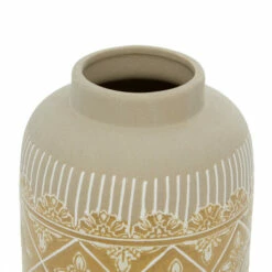 Use as a flower holder on your coffee, console, and kitchen tables, or as a decorative piece on a book shelf or office shelf. Displayed in your dining or living room, entryways or hallways, this vase is sure to bring charm and joy to any space. Due to the handmade nature of this item, no two will be alike, there will be slight differences in shape, size, and color. This item ships in one carton. Due to the handmade nature of this item, no two will be alike, there will be slight differences in shape, size, and color. Suitable for indoor use only. Set includes 2 large beige vases. Table vases with 2″ and 3″ rim opening. Bohemian theme.