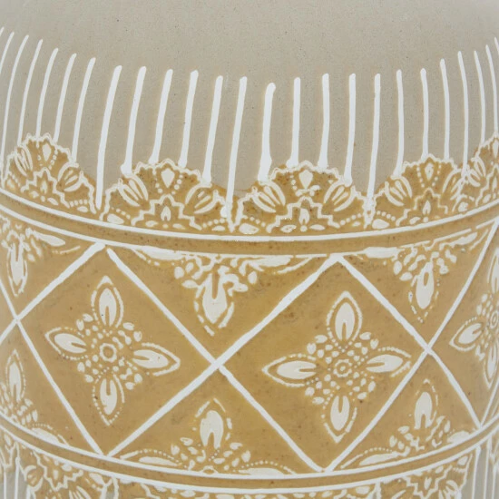 - Matte sandy beige finish with tan band of quatrefoil and acanthus patterns