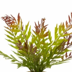 - This artificial plant decor carries glossy green leaves with red tips and a smooth beige vase