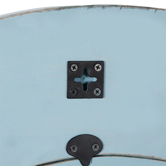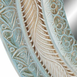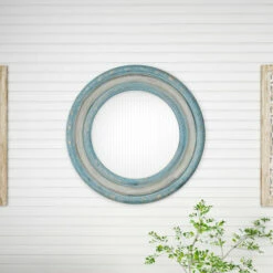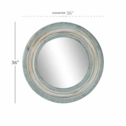 Add a touch of whimsy in your traditional inspired home with this extra-large round mirror. The mirror features an engraved rustic wood frame painted in a distressed powder blue and champagne beige finish. One can easily hang this mirror on farmhouse-style walls with a keyhole slot at the back. Cheery and natural, this extra-large round mirror with a wood frame is a great focal point in any farmhouse and traditional themed home. The wall mirror hangs on a screw via a built-in backing. Suitable for indoor use only. This item comes shipped in one carton. Made in India.
