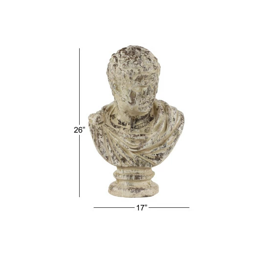 This large, distressed beige male bust has a very textural antique look and will be the perfect finishing touch on your mantle or shelf in your vintage-styled space. The large bust is made from resin and has a stone and wood-like texture. The eggshell white paint is heavily distressed revealing dark brown beneath. This sculpture has a Roman bust look of a male in antiquated garb. Set this as a centerpiece in your vintage style home to relive some ancient roman vibes. Designed with rubber stoppers at the base that prevent scratching furniture and table tops, as well as sliding around. Wipe clean with a dry cloth. Decorative distressing looks antique. Suitable for indoor use only. Vintage inspired. This item comes shipped in one carton.