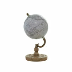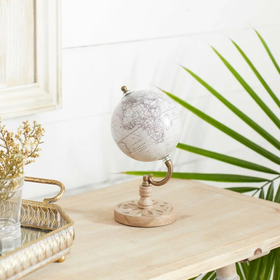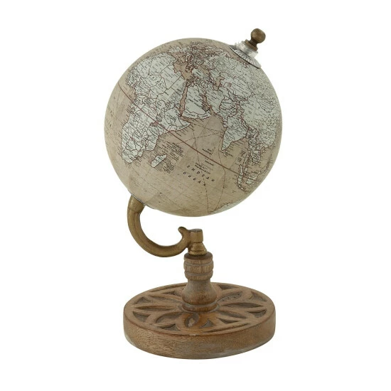 - Weathered beige and brown finish gives the globe an aged aesthetic