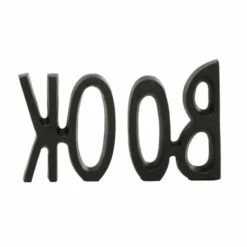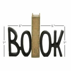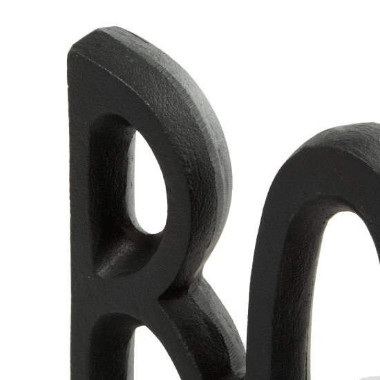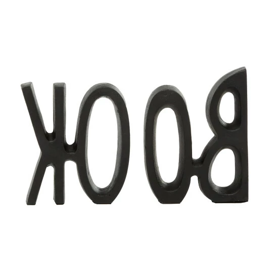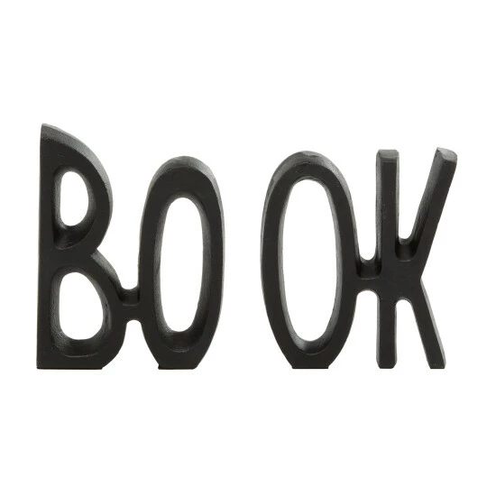 Replace your old, outdated bookends with this set of black “BOOK” sculptured metal bookends! The two pieces together form all caps “BOOK” spelled out in a long, narrow font with slightly raised ends for a modestly curved silhouette along the top. The matte black finish suits modern and contemporary spaces, while also working with any color palette in any style room. The dimpled texture of the aluminum adds some stylish character, as well. This item comes shipped in 1 carton. Suitable for indoor use only. Made in India. This set includes of 2 bookends. The “Book” serve as bookends. Designed with an industrial theme.