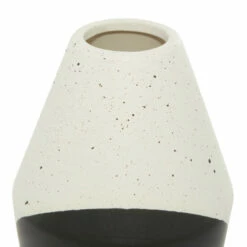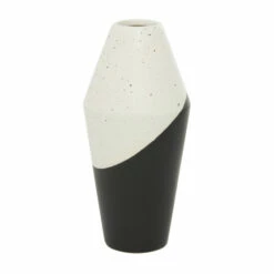 Alone or holding a small bundle of vase filler, this ceramic bottle vase features chic black and white color-blocking over its angled body. The small mouth can display a small bunch of botanicals, but this decorative vase also makes for an eye-catching stand-alone accent decor centerpiece with its bold contrast of diagonal speckled white and solid black-glazed sections. This versatile palette with bold shapes make a cool pattern in modern and contemporary homes and offices. Due to the handmade nature of this item, no two will be alike, there will be slight differences in shape, size, and color. This item ships in one carton. Suitable for indoor use only. Tapered cylinder vase with medium-sized rim opening. Contemporary design.