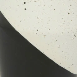 - Tall black and white ceramic vase with a coffin silhouette, features a two tone contrast it features a glazed black and speckled white finish