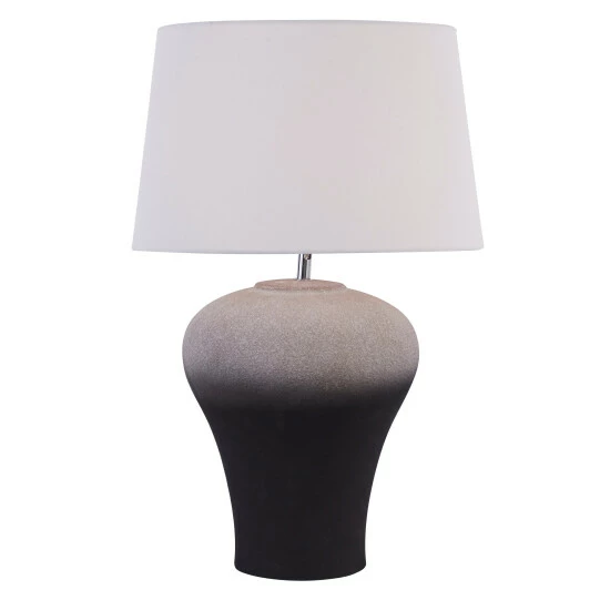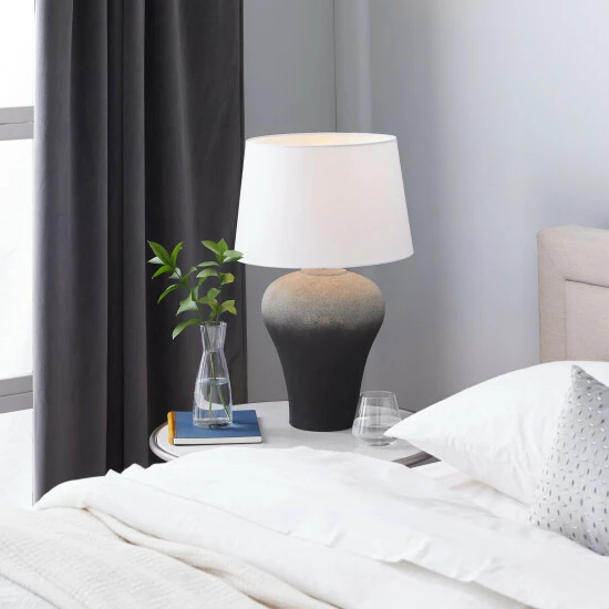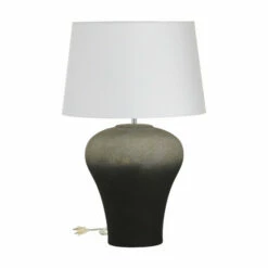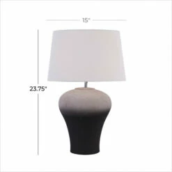 ย An eclectic lamp suits an rustic or transitional living space. This stunning lamp has a round shade and an ombre ceramic body. The gradient goes from black to grey, giving this lampshade a chromatic accent. Use it as elegant nightshade in the bedroom, home office, living room, or personal library. Uses one standard E26 light bulb (not included). This item has a 59″ cord length. Suitable for indoor use only. Lamp has a rotary on and off switch. This item comes shipped in one carton. Farmhouse-themed style.