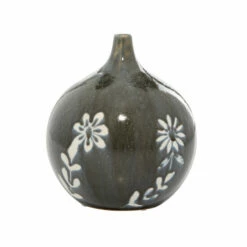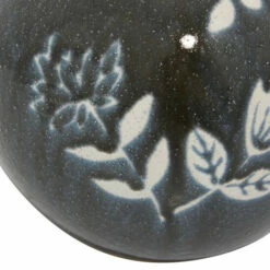 Alone or holding a single stem flower, this stout round ceramic vase features lovely hand-painted daisies around its rotund bottle shape. The small top with no lip has a bud vase style for displaying a single-stemmed botanical, but also makes for an eye-catching stand-alone accent decor centerpiece with its flower designs. The undertone throughout is a glossy, very soft black glaze that make the white flowers pop. These versatile colors with bold designs make a lovely and fun style splash in boho and eclectic homes and offices.