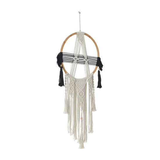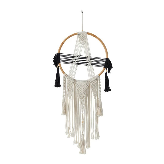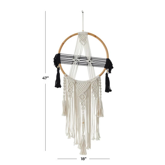 - Hanging macrame wall decor featuring a circle structure with white woven cotton details, black diagonal rope accent, dangling tassels, and brown bead accents