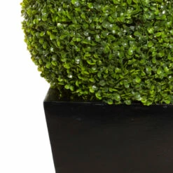 - Plastic topiary carries a smooth green finish and a glossy black planter