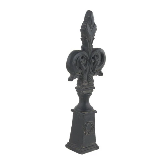 - This finial sculpture comes in a matte black finish with distressed details