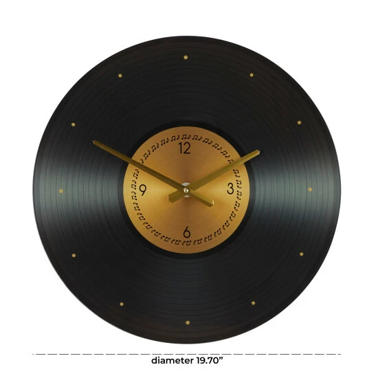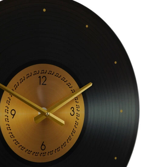 - Gold accent details highlight the soft sheen black finish of this wall clock