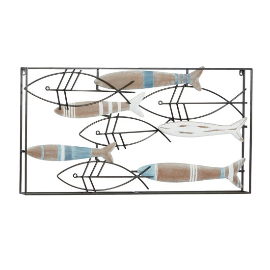 - This open-style wall art features various-sized fishes in a mix of wood and metal sculptures swimming together in one direction