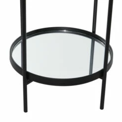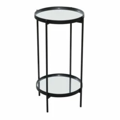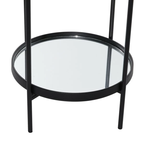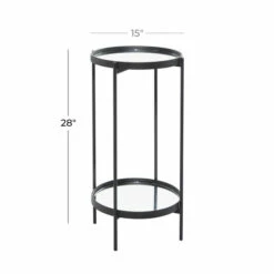 - This captivating round accent table features a reflective glass finish and a polished black iron finish