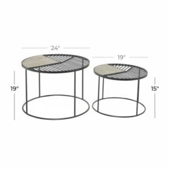 - Set of 2 round tables measure 23.5″L x 23.5″W x 18.5″H, 19″L x 19″W x 15″H and collectively weigh 11 lbs
