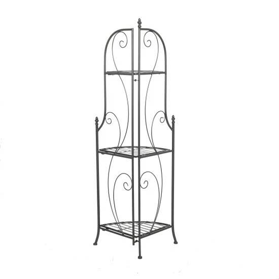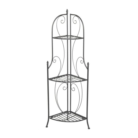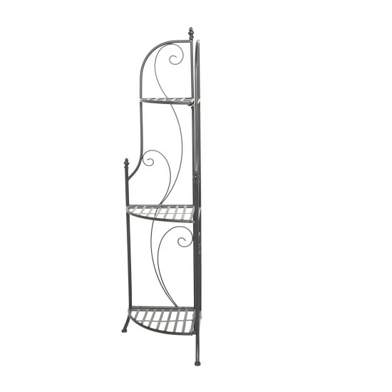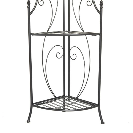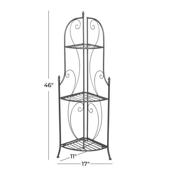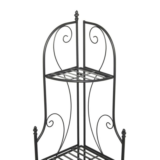 Create a sophisticated planter rack outdoor display as you decorate this 3 tier metal rack with solid white potted plants and ravishing stoneware sculptures. Keep your home clutter free and utilize this space saving bakers rack for all your storage needs. A storage piece that is spacious to keep your valuable organized and safe anywhere in your home. Designed with rubber footing at the base that prevent scratching, anti tipping, as well as sliding around. This item comes shipped in one carton. Suitable for indoor and outdoor use. Avoid using abrasive cleaning pads or detergents, use a sponge with mild soap and warm water, then rinse with a garden hose. This bakers rack is made from solid iron construction with protective coating making it impervious to the elements with anti-corrosive property. This bakers rack features a 3 tier metal shelving unit. Industrial style.. Features an industrial inspired design for clean lines and a structured appeal. Iron structure is painted with a special coating to help protect it from the elements. Iron may show signs of corrosion in salt air environments.. This triangular metal corner rack features a polished black iron finish. This tall bakers rack for plants showcases a 3-tier corner shelf unit with a triangular woven iron base and a swirly scroll accent body design. This item measures 17″L x 11″W x 46″H and weighs 6 lbs