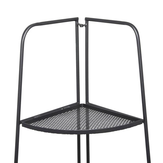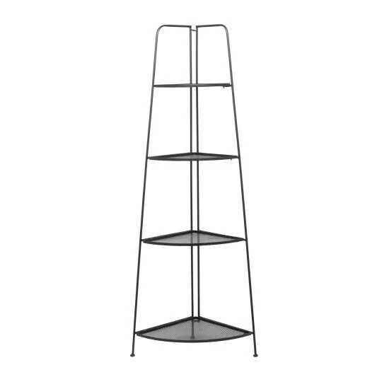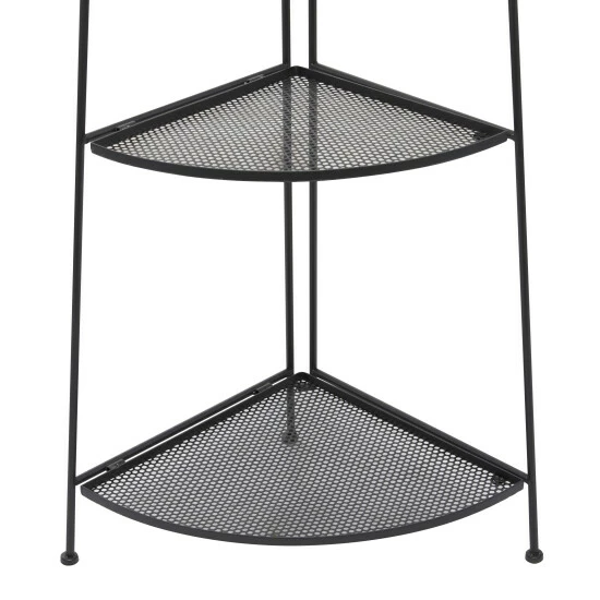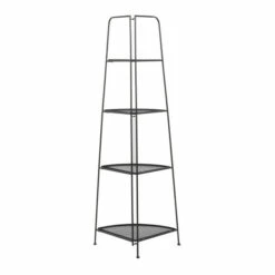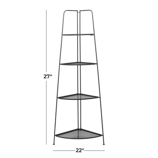 Place this chic corner rack on your living room, balcony, and the kitchen area for an all-around storage unit display. A storage piece that is spacious to keep your valuable organized and safe. Keep your home clutter free and utilize this space saving bakers rack for all your storage needs. Designed with black rubber stoppers at the base that prevent scratching furniture and table tops, as well as sliding around. This item is shipped in one carton. Iron is forged and hinges are attached at the center to form a foldable corner rack storage unit. Suitable for indoor and outdoor use. This standing bakers rack features a 4-tier shelving unit. Contemporary style. Maximum weight limit is 40 lbs.. A contemporary style offers neutral elements and basics form with a bold design. This metal storage rack is made of durable and sturdy iron material. This sophisticated metal rack features a solid black finish. This standing corner bakers rack features a 4-tier mesh tray shelving unit design with a pyramid inspired body structure. This item measures 22″L x 16″W x 27″H and weighs 7 lbs