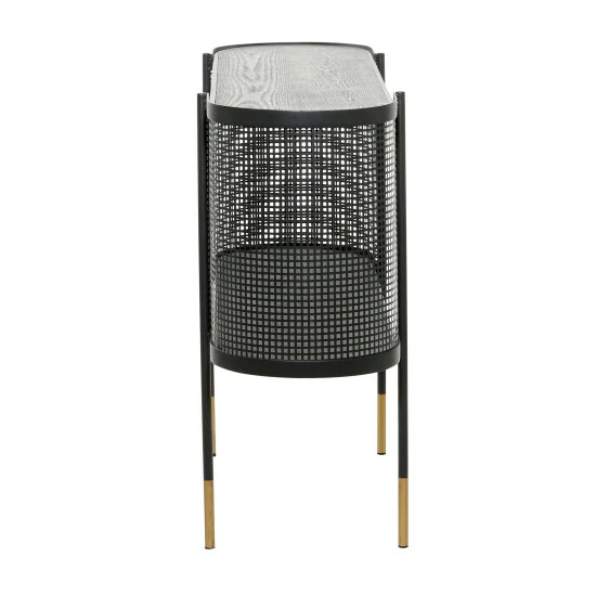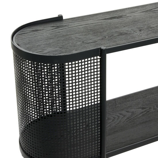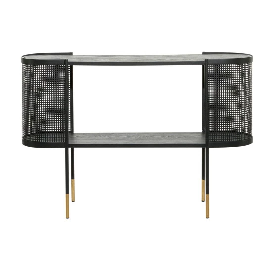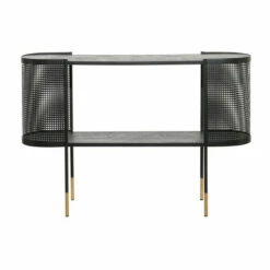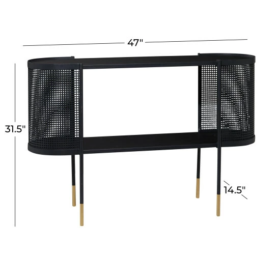 This elegant contemporary black metal console table will make a bold statement of style in your living room when paired with matching decor. Useful and elegant, console tables are more than just a place to throw your mail. Use it as an accent piece in the living room, library, bedroom, waiting areas, or hallways of you home. Designed with protective stoppers at the base that prevent scratching furniture and table tops, as well as sliding around. This item comes shipped in one carton. Suitable for indoor use only. Contemporary design. Maximum weight limit for shelf is 30 lbs.