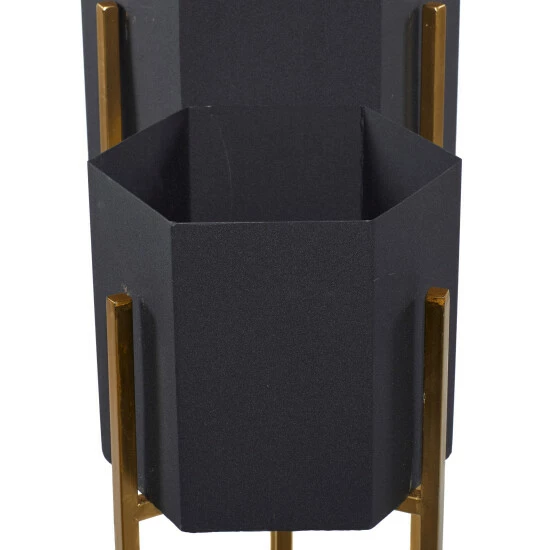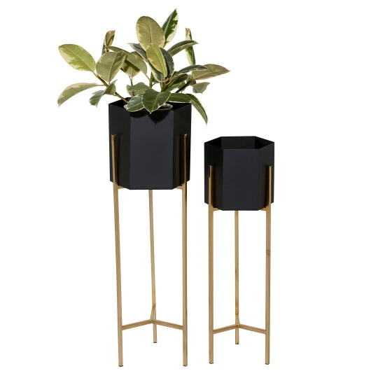 Leverage the variation in pot depth, stand height and color of this pair of indoor planters for contemporary, eclectic, or modern interior design atmosphere. These features will complement any color palette, pattern, and texture in your home. The solid construction of both Y-based stands and no-drainage hole pots are made in India from durable iron material to add pizzazz to a corner of your living space. The taller planter measures 11″ X 25″, while the smaller one is 9″ X 30″. Pots do not have drainage holes. This item ships in one carton. Planters do not have drainage holes but they are not watertight.