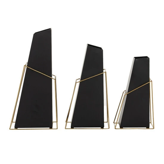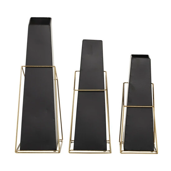 Pair together or break up this 3-in-1 set of metal geometric figures to offer your home both style and function. They work as vases, as décor holders, and as tabletop exhibits for contemporary, art deco, and modern interiors. Bodies are iron paint-coated to have a ceramic-like finish. Vases stand 10″, 11″, and 14″ tall, respectively. Best used as standalone decors or with fake flowers as this set does not have drain holes.