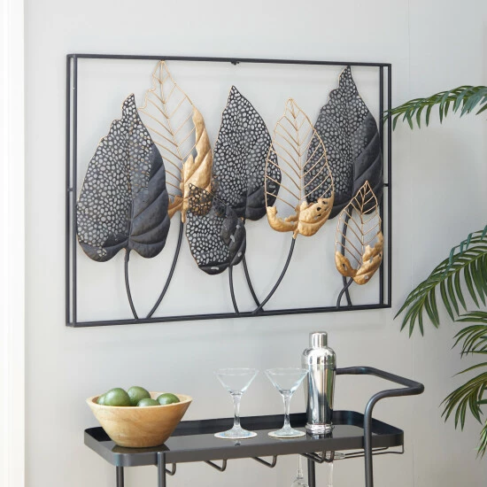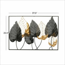 Create an excellent focal point on your walls paired with some cute accent tables, and level up your home with this amazing wall decor . It makes a great centerpiece over your sofa or in your dining room . Place this beautiful wall decor set in any room of your shabby chic inspired home and get an instant boost of style. Designed with a black metal frame. Easily hanging using hanging hardware on the back. Contemporary design. Hardware on the back allows for easy hanging. This item comes shipped in one carton.. Features a shabby chic style inspired design for that elegant vibe. This beautiful wall decor is crafted from the finest metal materials. This beautiful wall decor comes in a black finish with a luxurious gold accent. This metal wall decor features dark shaded leaves sporting small circular patterns while some leaves are in gold and are designed with their natural venation pattern for a natural look in luxurious gold. Wall decor measures 38″L x 3″W x 26″H and weighs 7 lbs